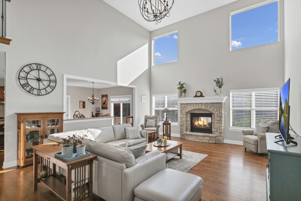 Nothing to do but move into this stunning 4-bedroom Overstreet semi-custom home in desirable Highland Woods in Elgin, offering resort-style living with a clubhouse, pool, splash pad, exercise facilities, volleyball, tennis, and basketball courts, plus scenic walking trails. Step into the inviting entryway that opens to a formal dining room with crown molding and wainscoting, along with a versatile living room or den. The dramatic two-story family room is filled with natural light and features a cozy stone fireplace. The kitchen impresses with 42-inch cabinets with crown molding, stainless steel appliances including built-in ovens and a separate cooktop, granite countertops, tile backsplash, an expansive island with breakfast bar, pendant lighting, and an eating area with a slider leading to the outdoor space. The main level also includes a convenient powder room, a mudroom area with drop zone, and a laundry room with sink. A rare first-floor primary bedroom offers a walk-in closet and an en-suite bath with double sinks, soaking tub, and separate shower. Upstairs, you'll find three generously sized bedrooms, including one with a private en-suite bath and a Jack and Jill bathroom. The unfinished basement provides endless potential for additional living space. Outside, relax on the stamped concrete patio with pergola overlooking the professionally landscaped, fenced yard, all in a prime location near shopping, dining, schools, the Big Timber Metra station, hospitals, and more-truly a perfect place to call home.